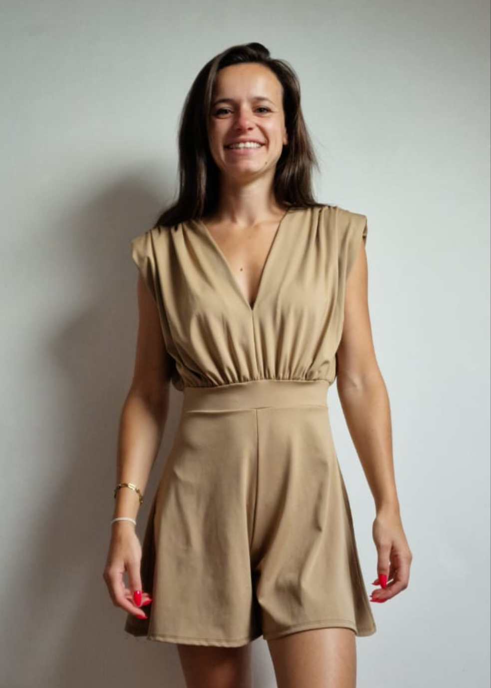 Deze stijlvolle combishort straalt klasse en zelfvertrouwen uit. Het mouwloze design gecombineerd met sterke, gestructureerde schouders zorgt voor een moderne look