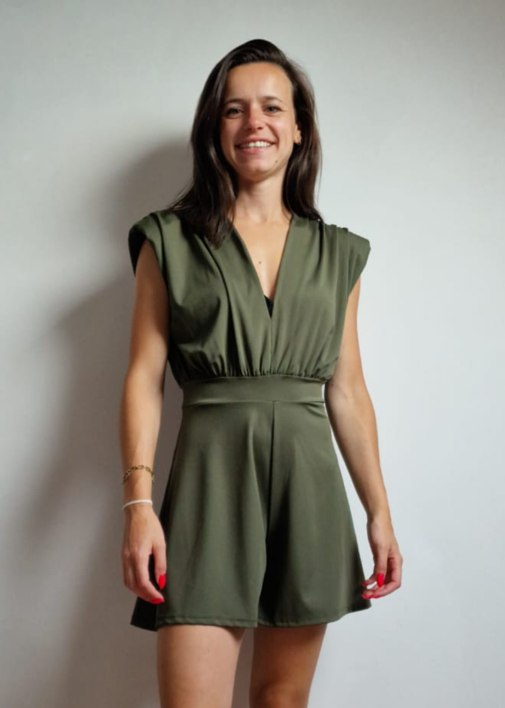 Deze stijlvolle combishort straalt klasse en zelfvertrouwen uit. Het mouwloze design gecombineerd met sterke, gestructureerde schouders zorgt voor een moderne look