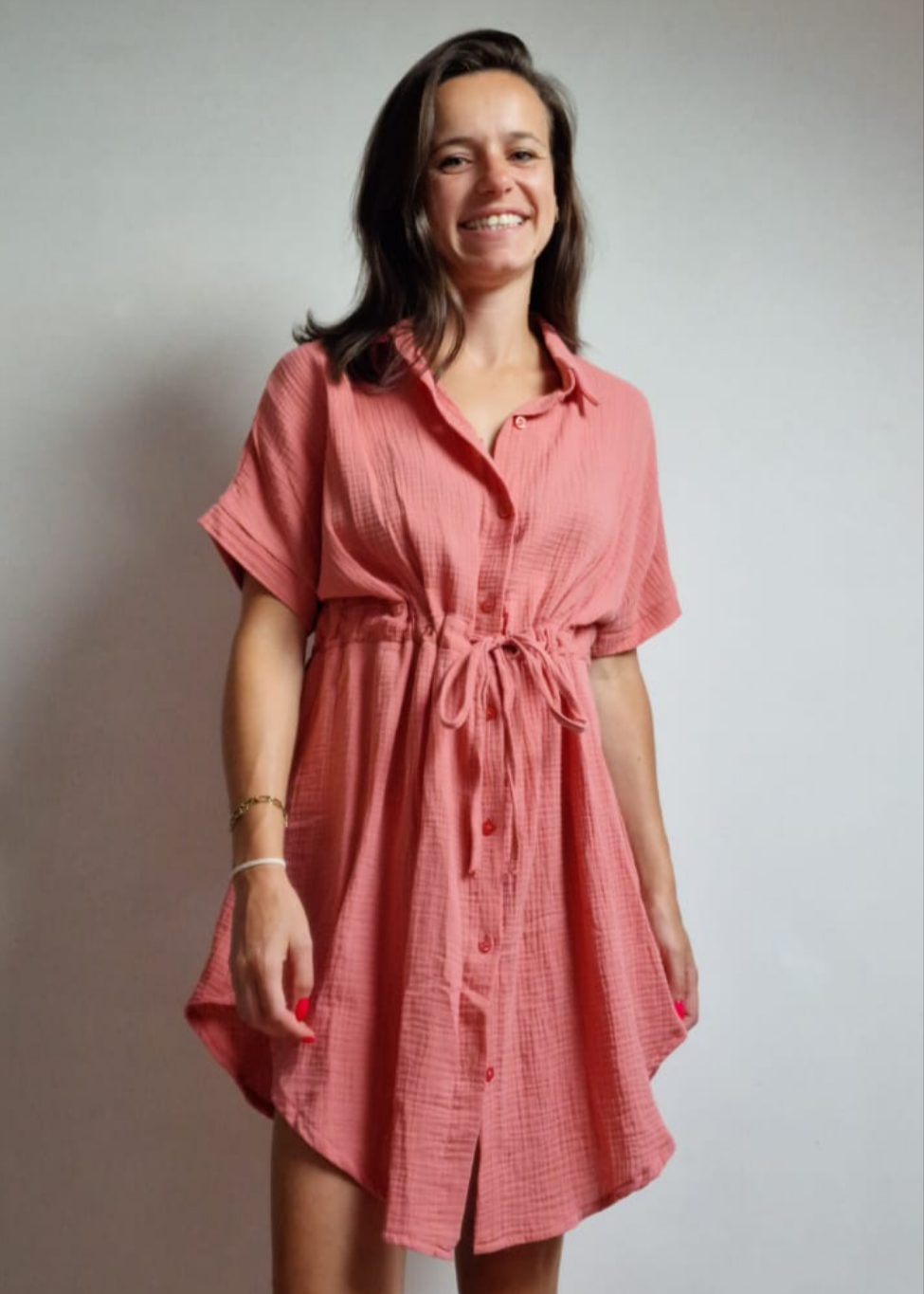 Deze shirtjurk combineert het beste van twee werelden: luchtige katoen-gaze (mousseline) en een subtiele stretch voor extra comfort. Het losse silhouet geeft een relaxte, effortless look, terwijl de knoopsluiting en kraag zorgen voor een tijdloze touch. Perfect voor warme dagen, city strolls of een laid-back kantooroutfit.